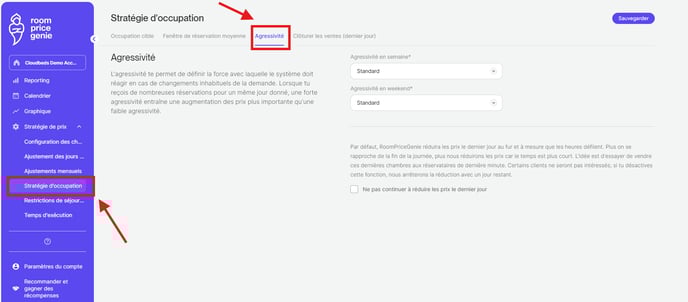 Qu'est-ce que l'agressivité ? L'agressivité est le degré auquel nous modifions les prix en fonction du taux d' occupation. Un niveau d'agressivité élevé entraîne des variations de prix plus importantes (augmentations ou diminutions) lorsque les taux d'occupation évoluent (hausse ou baisse).