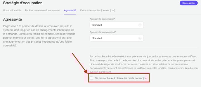 Dans la section agressivité, vous pouvez également gérer vos préférences concernant l'arrêt de la réduction des prix le dernier jour : par défaut, RoomPriceGenie réduira les prix le dernier jour au fur et à mesure que les heures s'écoulent. Plus la fin de la journée approche, plus nous réduisons les prix, car il reste moins de temps pour vendre l'inventaire restant.