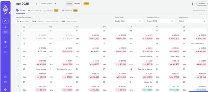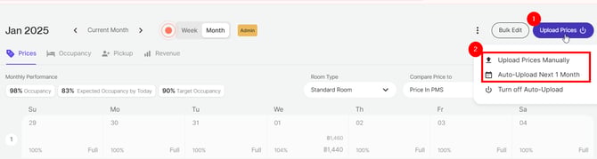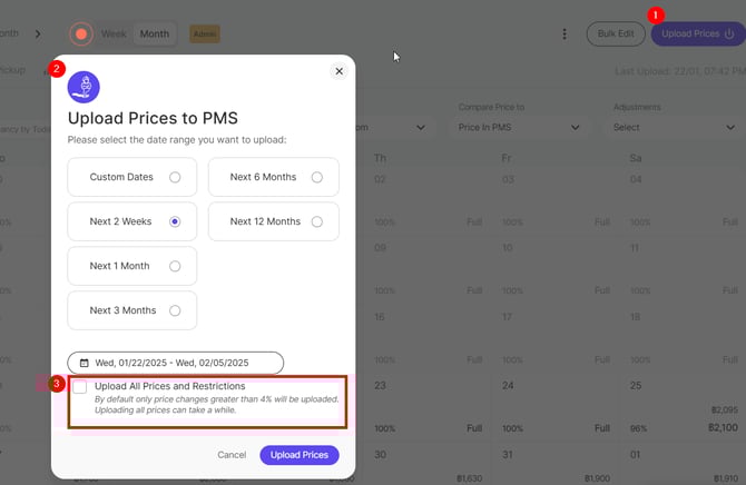 Toutefois, si vous souhaitez mettre à jour les nouveaux prix immédiatement, vous pouvez cliquer sur "Charger les prix ""Upload Prices" en haut à droite de votre calendrier (voir ci-dessous).