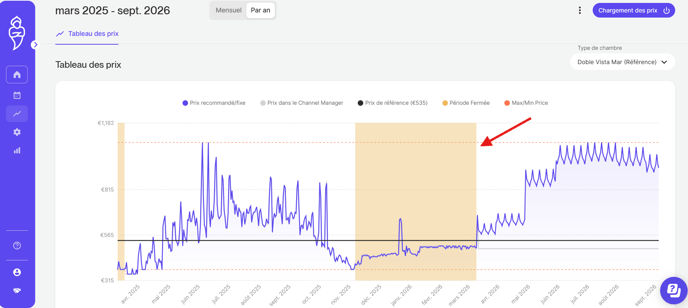 Si toute la propriété est fermé (fermeture saisonnière, rénovation complète), fermez simplement 100 % des unités pour les dates concernées ; le calendrie et graphique dans RoomPriceGenie mettront la période fermée en surbillance, comme ci-dessous.