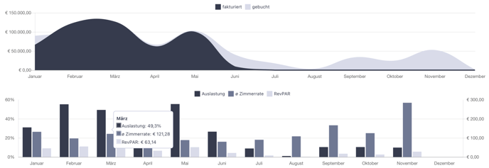 En bas de la page, vous trouverez un aperçu sur 12 mois des indicateurs clés de performance (KPI) : : Taux d’occupation, Tarif moyen journalier (ADR) et Revenu par chambre disponible (RevPAR):