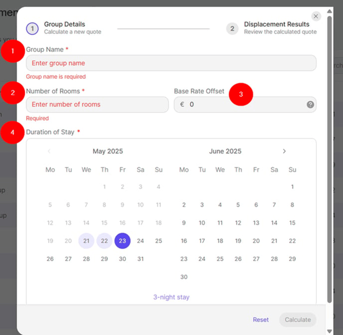 - La part de remise de 50 % (l' hypothèse de remise): Le système suppose que 50 % du bénéfice potentiel du revenu déplacé est offert sous forme de remise afin de rendre le devis compétitif par rapport aux tarifs publics (par exemple, ceux affichés sur Booking.com ou le site web de l'hôtel). Cette hypothèse est fixe, mais vous pouvez ajuster manuellement le prix total du groupe pour appliquer une remise plus ou moins importante.