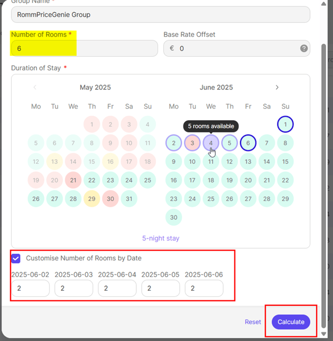 💡Une fois que vous aurez sélectionné la durée du séjour, vous pourrez faire défiler la fenêtre pop-up et personnaliser le nombre de chambres par jour.