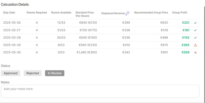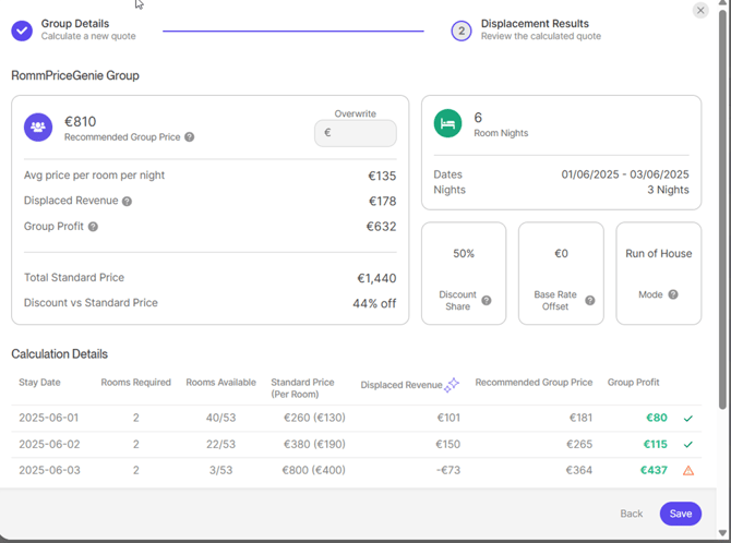 RoomPriceGenie plafonne le tarif groupe au tarif standard total (plus compensation). Si les revenus déplacés dépassent ce plafond, le profit peut apparaître comme négatif certaines nuits.