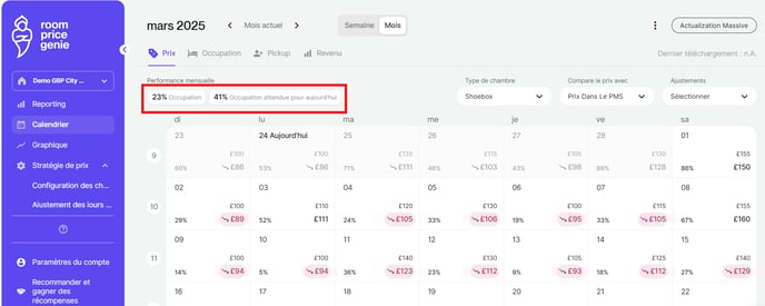 Le taux d'occupation réel par rapport au taux d'occupation prévu est indiqué dans le calendrier d'occupation. Le calendrier d'occupation est codé par couleur et vous indique si vous êtes au-dessus ou au-dessous de vos attentes. Le violet signifie que vous êtes au-dessus de la cible d'occupation prévue et l'orange que vous êtes en dessous de vos attentes (coin gauche de la cellule).