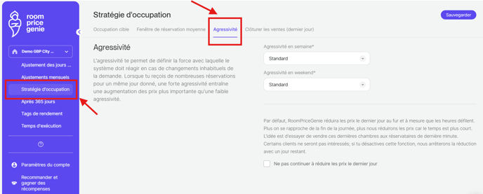 Nous recommandons généralement de laisser ce paramètre sur Standard. Pour quelques très petits hôtels, nous suggérons Bas ou Très bas. Pour en savoir plus, cliquez ici: Agressivité.