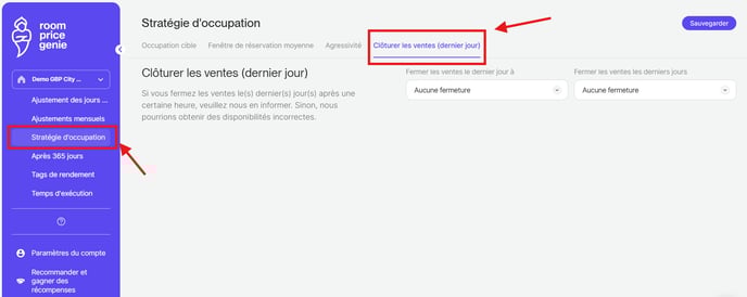 Si vous clôturez les ventes au cours du (des) dernier(s) jour(s) après une certaine heure, veuillez le signaler dans RoomPriceGenie. Dans le cas contraire, nous pourrions obtenir des disponibilités erronées.