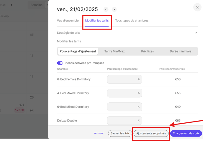 1) Utilisez l'option "Supprimer les ajustements" dans la fenêtre pop-up des prix.