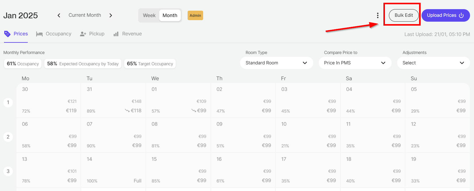 Si vous avez besoin de supprimer vos ajustements manuels pour une période définie, il vous suffit d'utiliser l'option « Suppression en bloc/ actualization massive» dans la vue du calendrier.