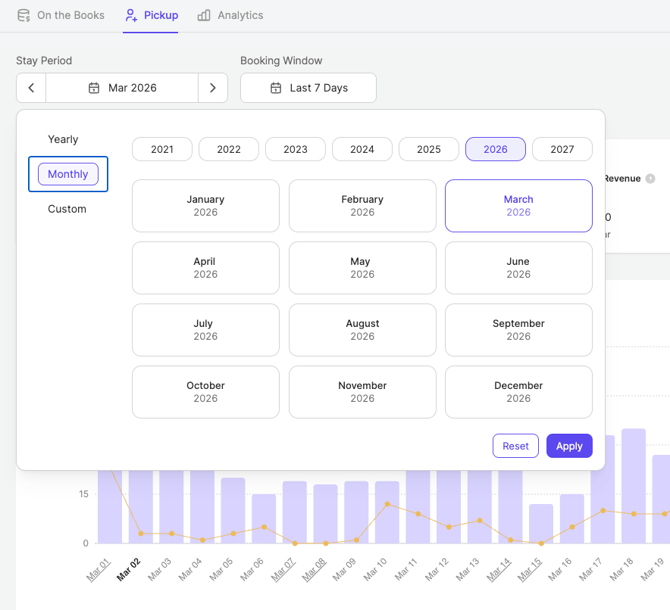 Le tableau de bord de Pickup est une vue de reporting qui vous aide à comprendre comment les clients réservent au fil du temps pour les dates de séjour sélectionnées.