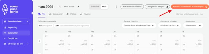 En utilisant le mode de chargement automatique de RoomPriceGenie, vous pouvez simplifier le processus de chargement des prix pour plusieurs jours. Il s'agit d'une fonction efficace de RoomPriceGenie qui vous permet de gagner un temps précieux que vous auriez normalement passé à ajuster manuellement vos prix. Le "chargement automatique" effectue automatiquement des calculs et met à jour vos prix jusqu'à 12 fois par jour pour les 365 jours (ou 18 mois) à venir, garantissant ainsi que vos prix sont toujours optimisés. Cela signifie que vous n'avez besoin de vous connecter et d'apporter des modifications que lorsque vous estimez que des ajustements sont nécessaires.
