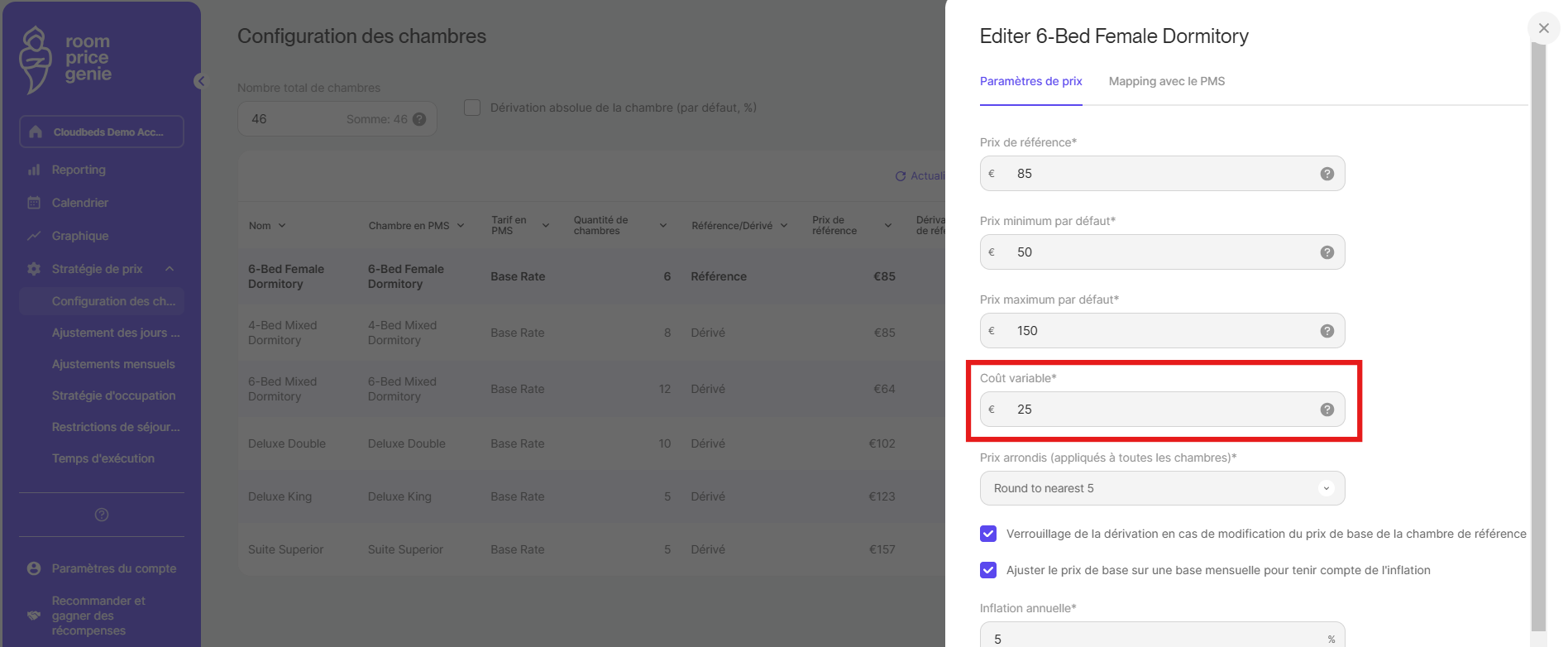 Les charges variables découlent des types de chambres. Pour simplifier les choses, vous n'avez besoin de fixer les charges variables que pour votre chambre de référence.