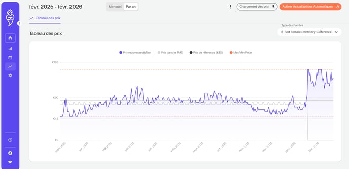 Le prix de base (en bleu) suit le marché local (en rouge). Ces chiffres représentent le prix de base fixé dans la configuration des chambres plus le facteur du marché.