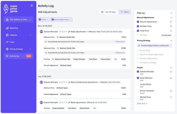 The Activity Log is a chronological record of manual price adjustments made by users for a specific property.