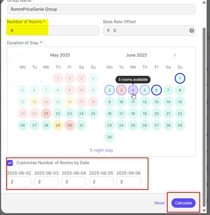 💡Once you select the Duration of the Stay, you will be able to scroll down the pop-up and customise the quantity of rooms per day