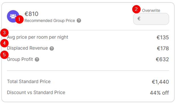 - Recommended Group Price: The Total price for the whole stay we recommend for the group.