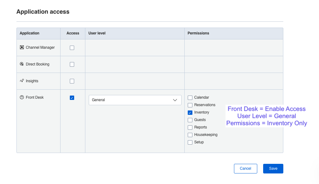For the access rights, please activate “Front Desk” only and select “General” as user level. Then tick the box for “Inventory”.