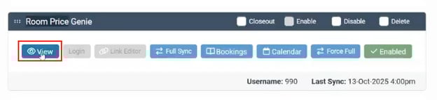 In the channel list, locate RoomPriceGenie and click on “View” to open the channel configuration page.