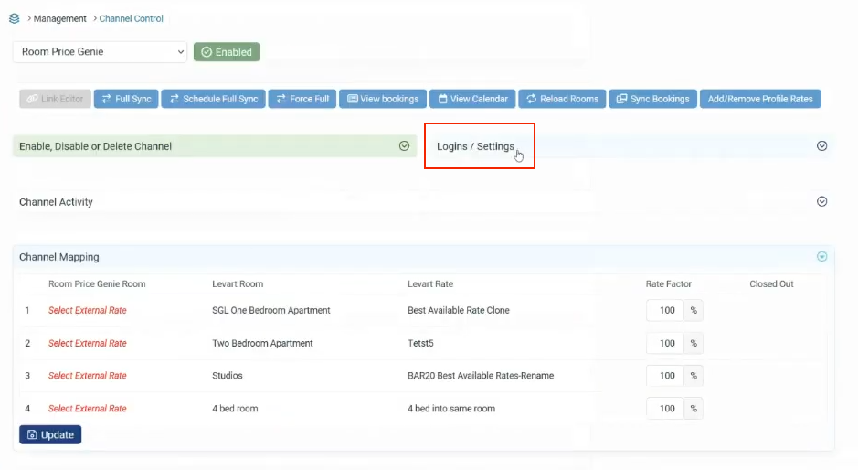 Once inside the RoomPriceGenie channel page, click on “Logins / Settings” to access the credential setup.