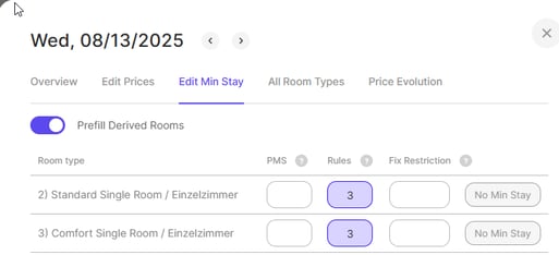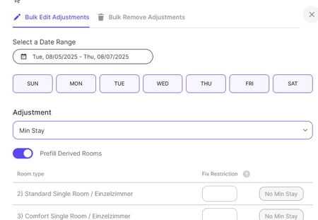 - Set Min Stay Rules Automatically (Pro): Automatically apply restrictions based on lead time and occupancy.Example: Apply a 5-night Min Stay rule 5 days before arrival when occupancy > 80%.