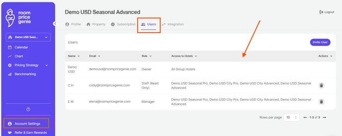 In case, you are not the only person working with our pricing solution, you can create additional users in the RoomPriceGenie app. If you have several properties you also need to select the property you wish the new user to have access to. Navigate to Account Settings > Users.
