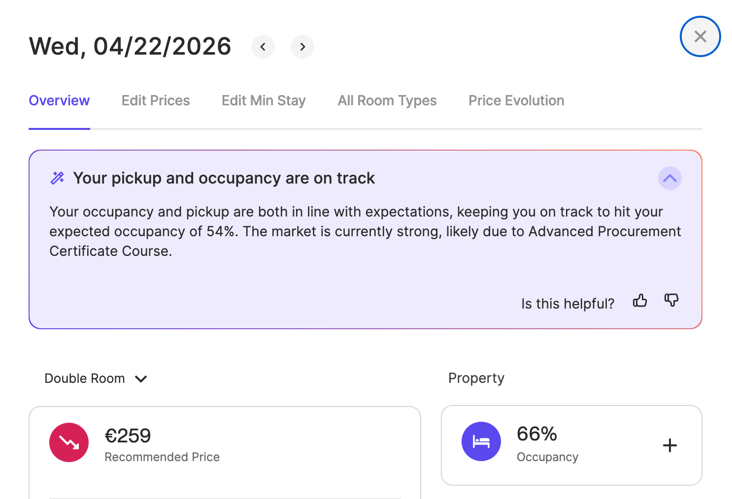 The recommended price shown is for your reference room. Occupancy details like current and expected occupancy reflect your entire property.