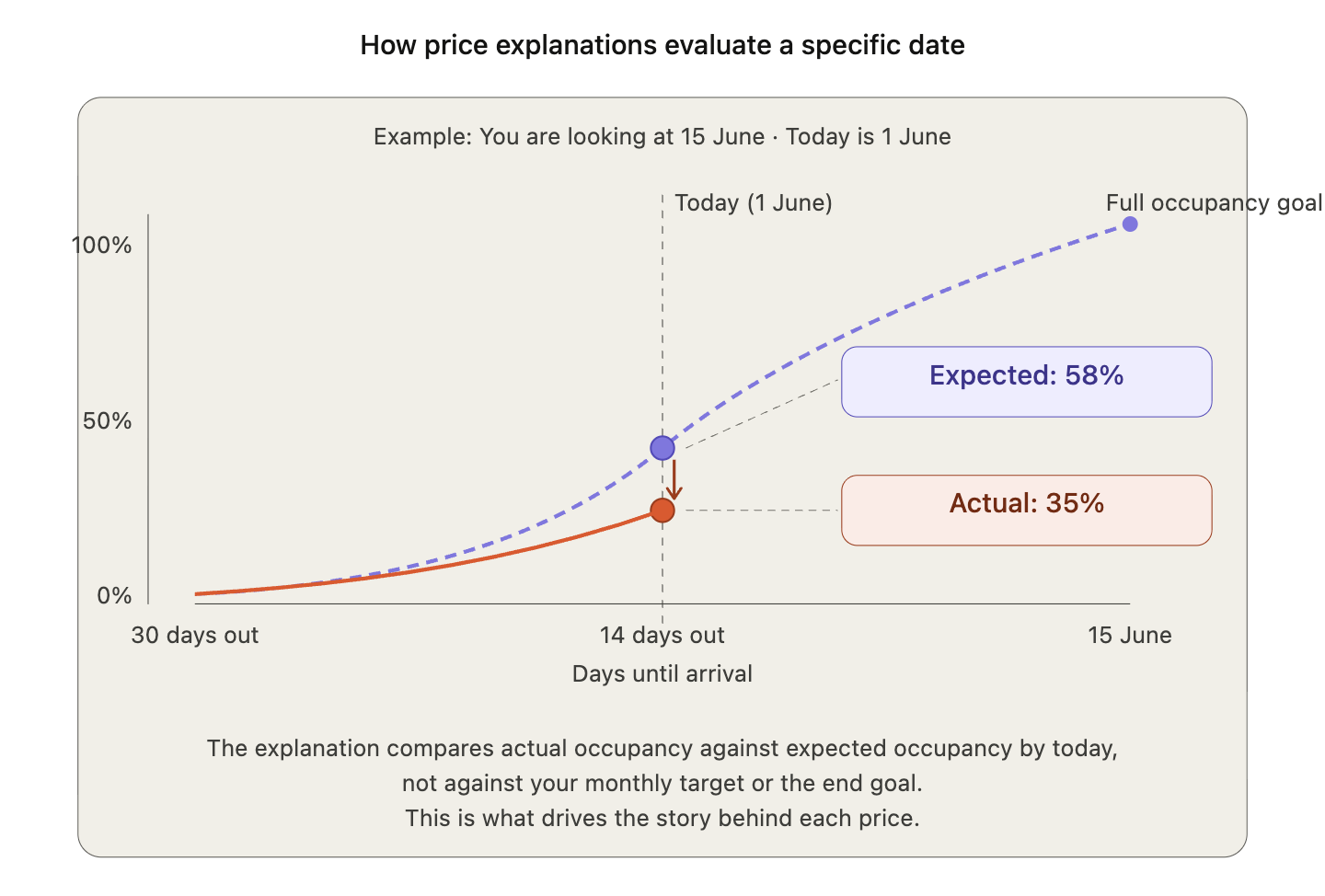 You set monthly target occupancy under your Occupancy Strategy. But the price explanation is not about your monthly target — it's about one specific date and how that date is performing right now.