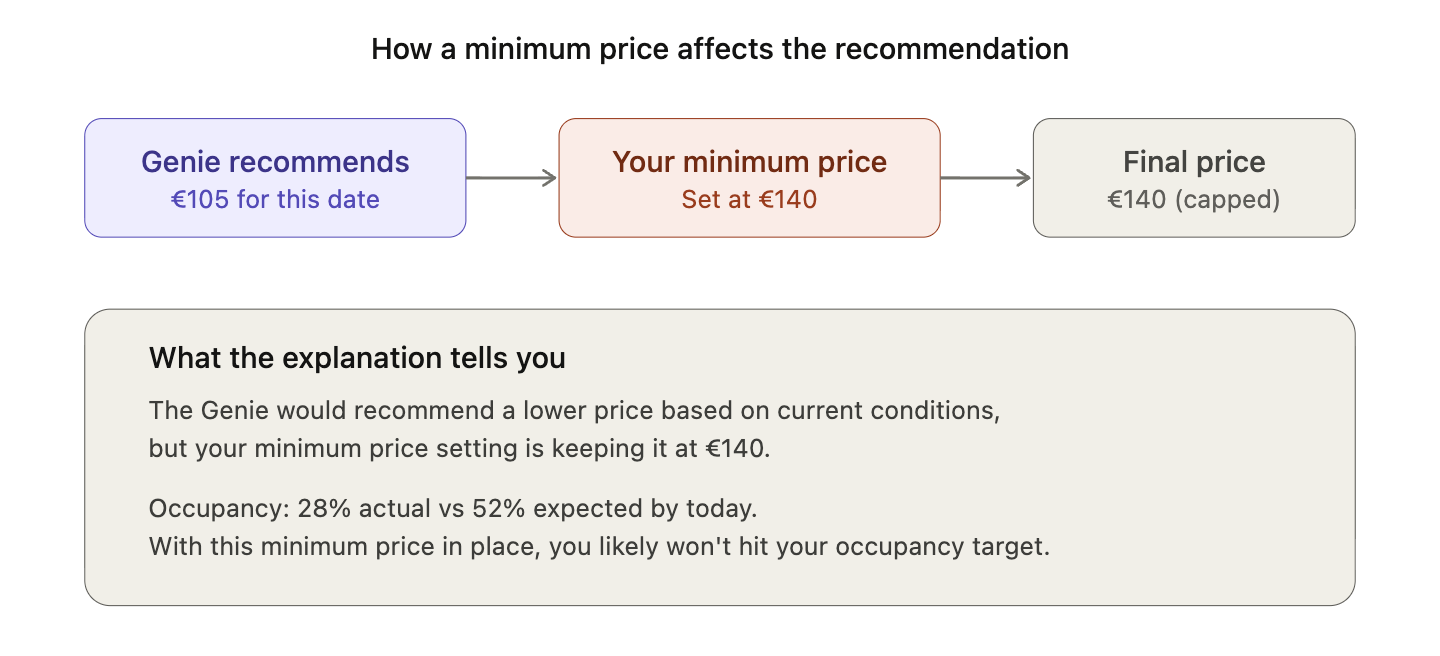 The recommended price would be €105, but your minimum price is keeping it at €140. Your settings may be costing you bookings — review whether your minimum price is still right for this period.