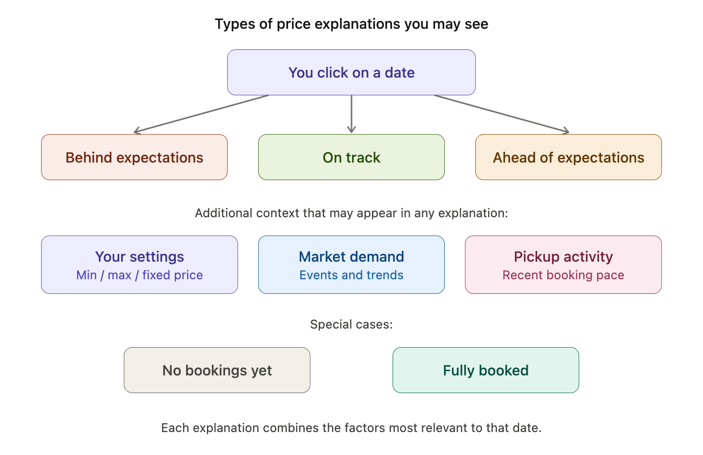 - Your settings — is a minimum price, maximum price, or fixed price limiting the recommended price? This catches when your own settings might be costing you money or bookings.