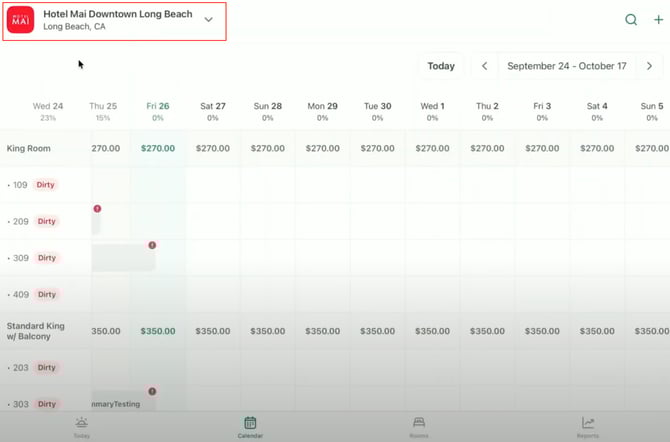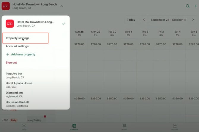- From the main navigation, open the property selector at the top of the screen and choose the property you wish to connect (e.g. Hotel Mai Downtown Long Beach).