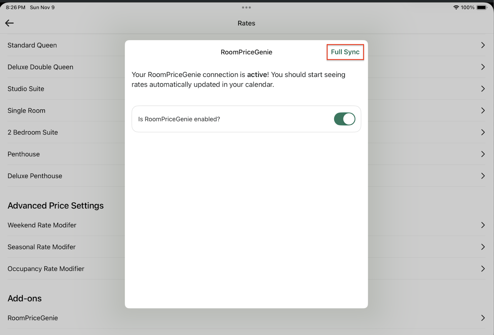 After activation, please inform our team. Our Genies will proceed with the mapping upon confirmation. Once the mapping is done please perform a Full Sync to push Availability and Rates to RoomPriceGenie: