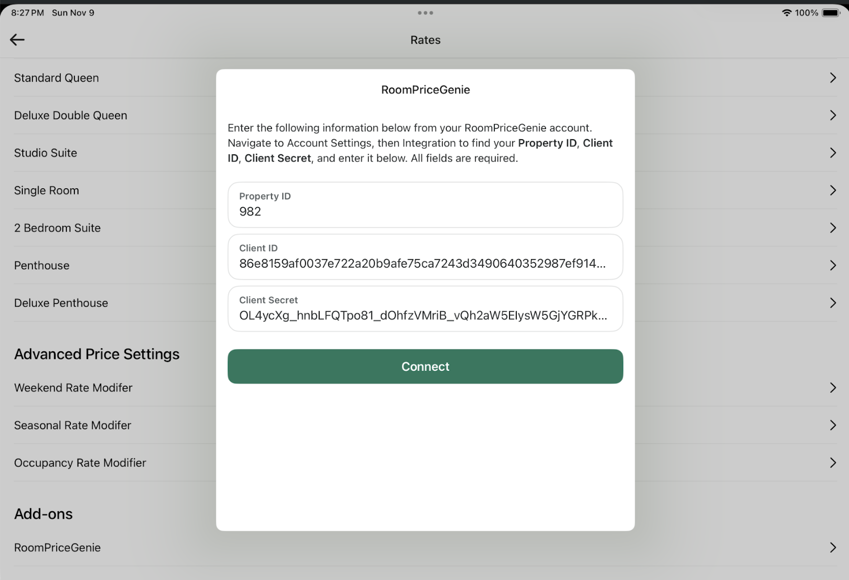 Copy the three values that RoomPriceGenie team has shared with you and paste them into the corresponding fields, then click on "Connect":