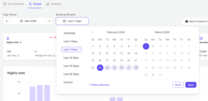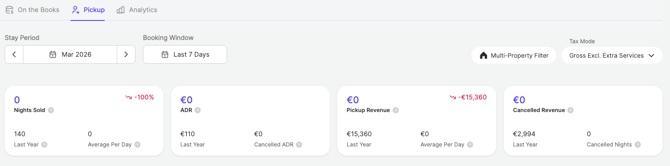 El panel de Pickup muestra cuántas noches se han reservado dentro de una ventana de reserva seleccionada, cuántas se han cancelado y cómo se compara esta información con el año anterior (LY). Esto te ayuda a evaluar si tu ritmo de reservas es saludable y si está alineado con tus expectativas.