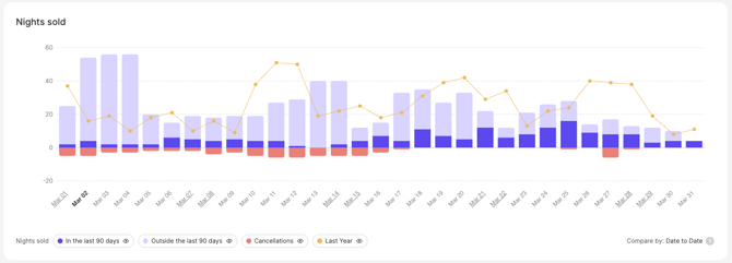 Línea de comparación con LY: noches vendidas dentro de la ventana de reservas seleccionada.