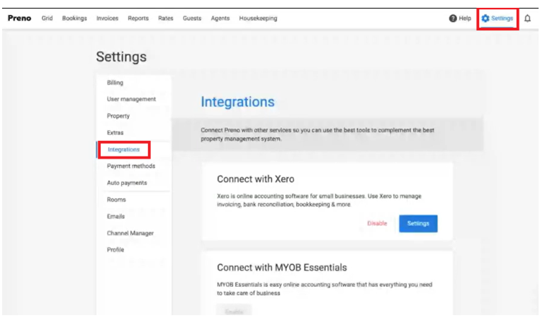 Paso 1: En Preno, haz clic en Configuración (Settings) y luego en Integraciones (Integrations).