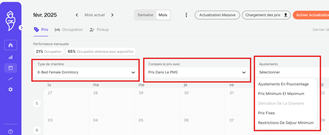 Pour visualiser toutes les modifications que vous avez apportées, il vous suffit de sélectionner le type de chambre/appartement et choisir l'ajustement que vous voulez visualiser. La vue du calendrier affichera tous vos paramètres actuels. Vous pouvez également regarder une démonstration de ce processus.