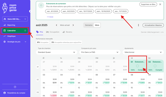 Lorsque votre propriété enregistre une forte augmentation des réservations en peu de temps, RoomPriceGenie vous enverra rapidement un e-mail et affichera des indicateurs dans l'interface de votre compte pour les dates à forte demande. Cela vous permet de prendre le temps et la flexibilité nécessaires pour évaluer la situation et ajuster les prix en conséquence.